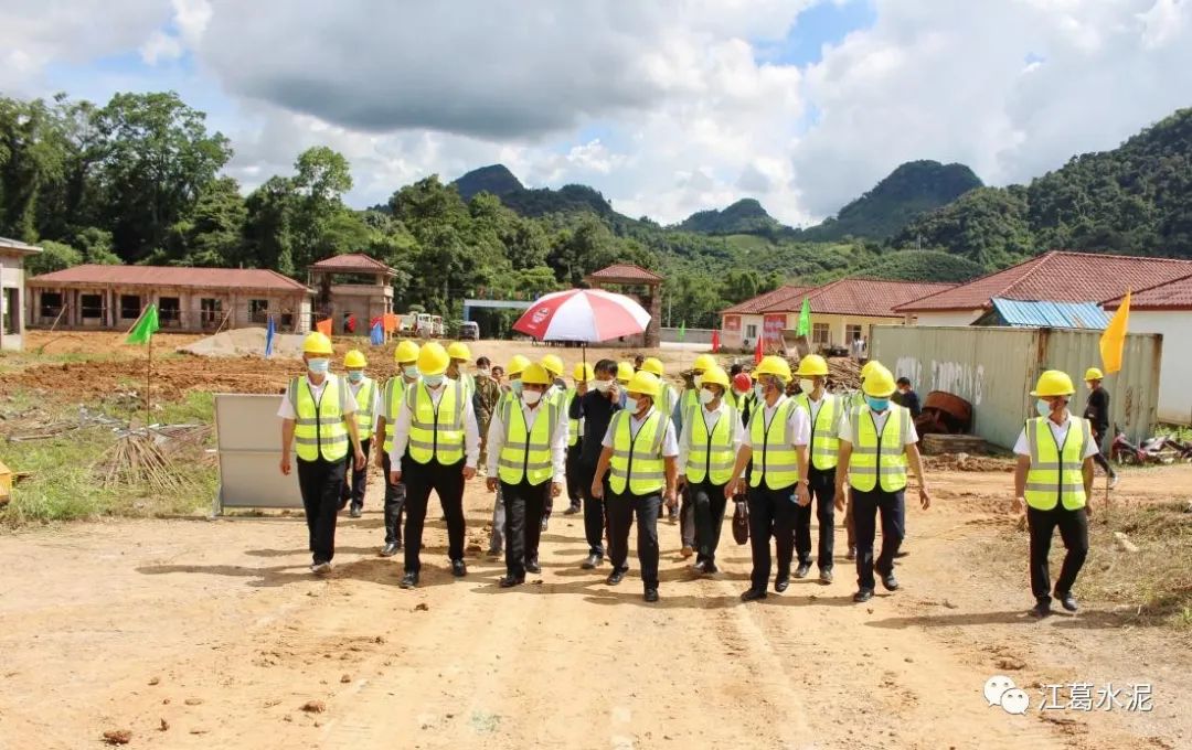 2022年8月16日,老挝人民革命党中央政治局委员、中央书记处常务书记、国家副主席本通·吉玛尼一行调研指导乌多姆塞江葛水泥厂。乌多姆塞江葛水泥厂建设指挥部领导班子、安装公司负责人、设计公司负责人、土建公司负责人、装修公司负责人、115KV电力专线工程负责人等陪同调研。