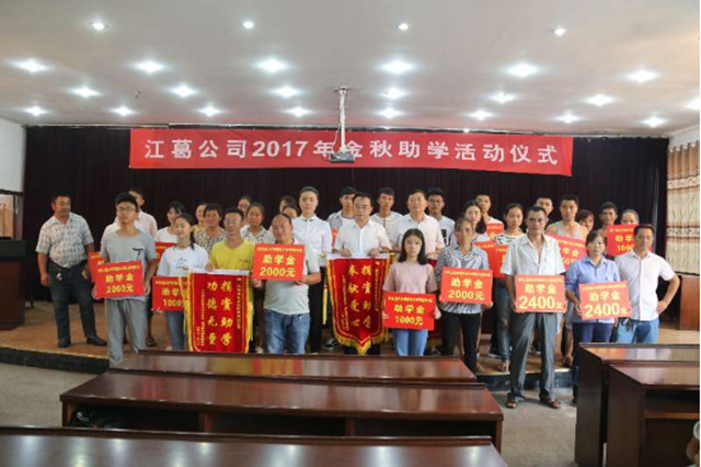 真情点燃希望,爱心成就梦想。2017年8月25日,江葛公司在多功能会议室举行2017年金秋助学活动仪式,对在今年高考中被国家一二本院校录取且家庭困难的23名岩孔坝、梭米孔村及员工子女进行资助,帮助他们圆梦大学。受资助的学生及家长,岩孔坝、梭米孔村支两委负责人,公司领导及部分员工代表参加了活动仪式。